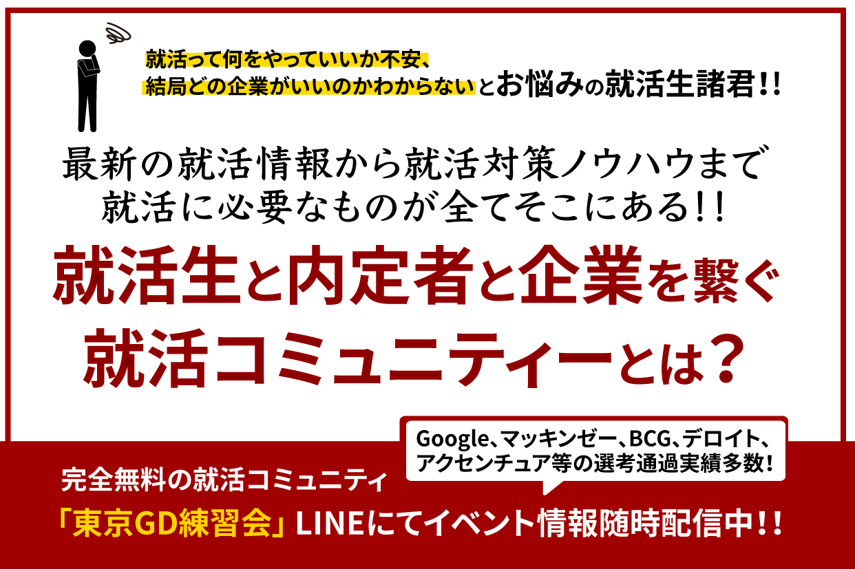 オンラインGD練習会は、就活生と内定者と企業人事を繋ぐ就活生の元就活生による無料就活コミュニティです。就活対策における理論(基本的にはオンライン)と実地練習会(毎週程度、グループディスカッションの練習会を開催)を就活中の皆さんに提供します。また、学生にはあまり馴染みのないBtoB企業や認知度が低いが将来の成長に見込みのある優良ベンチャー企業との接触機会提供しています。